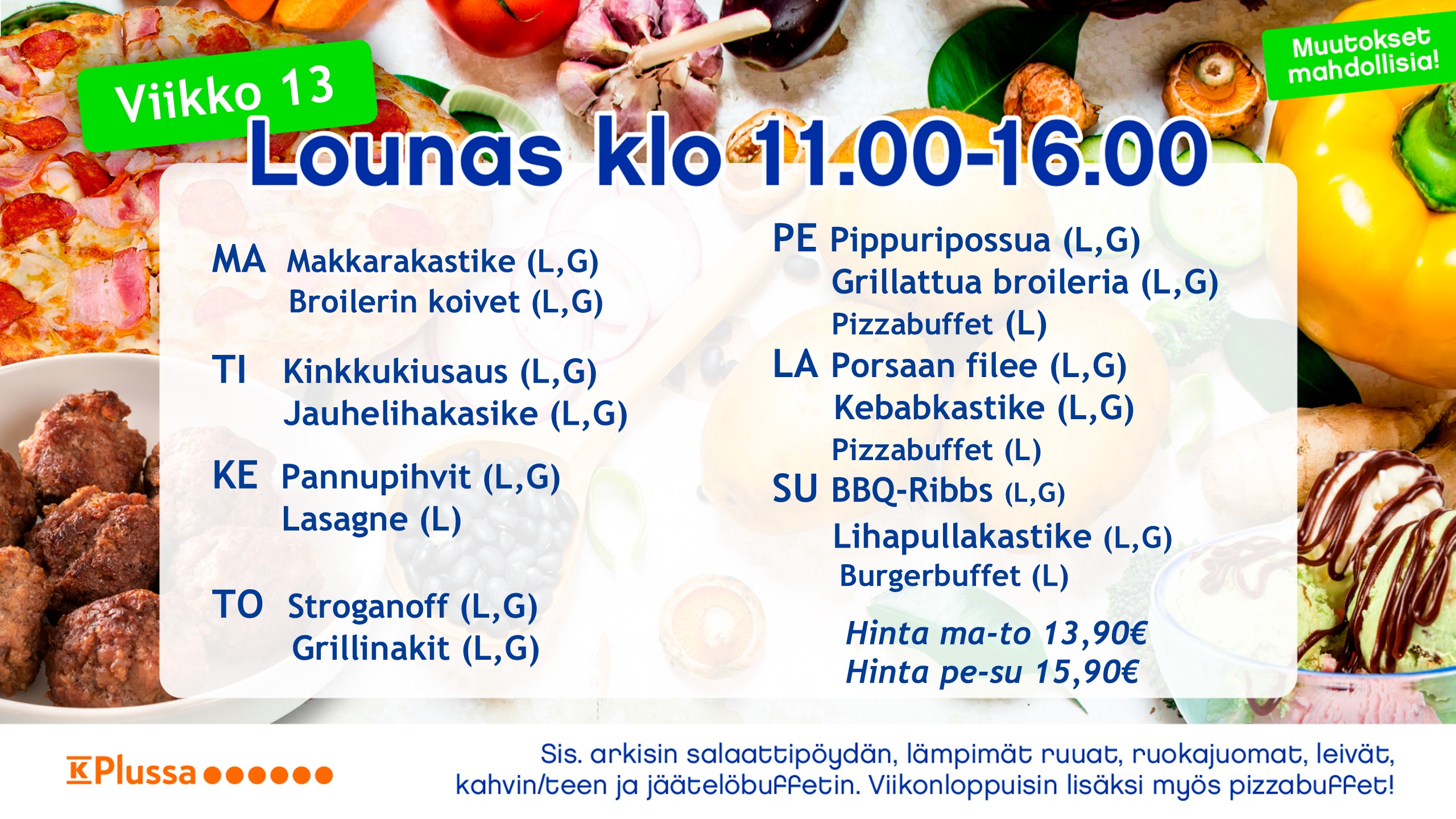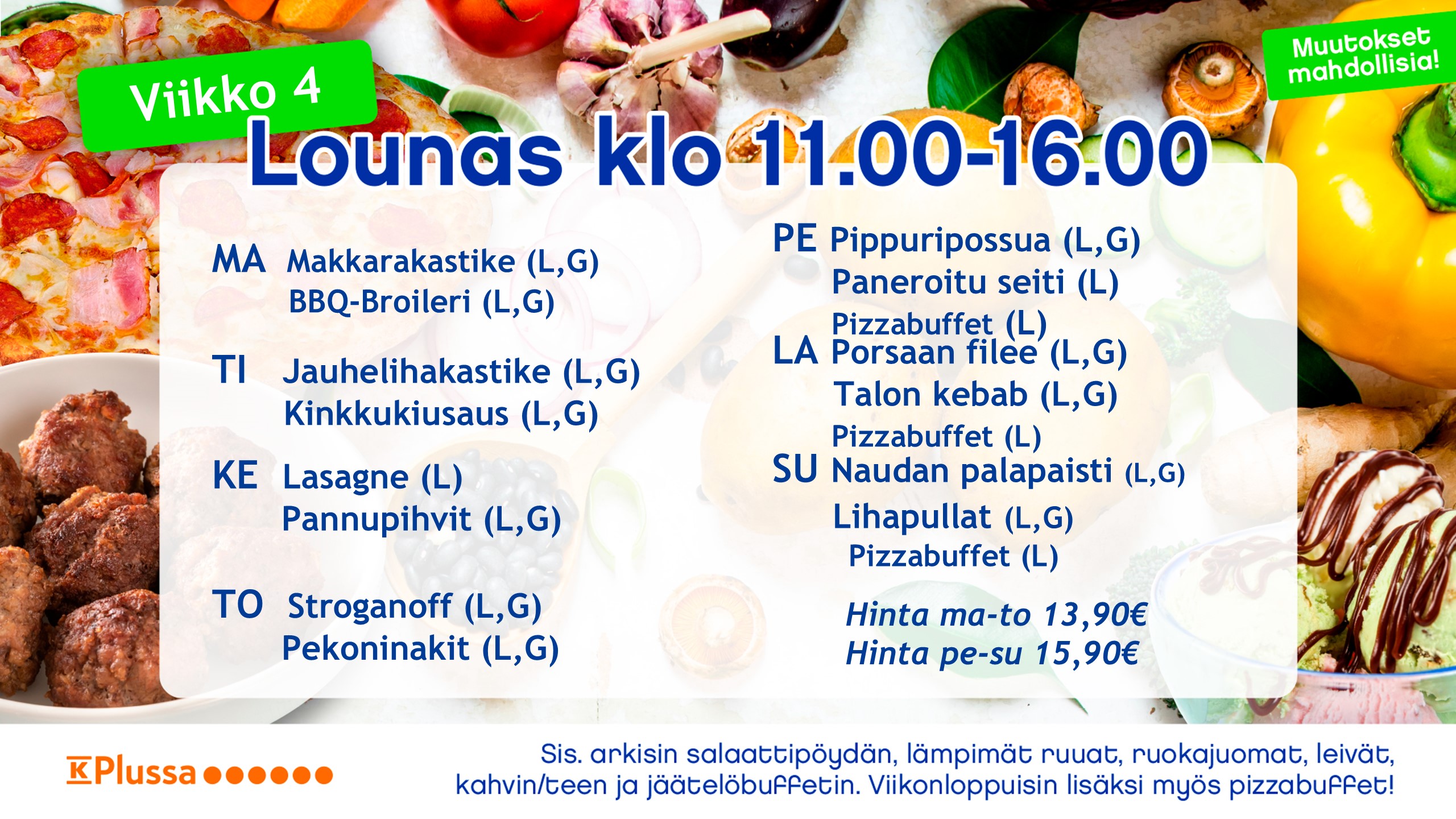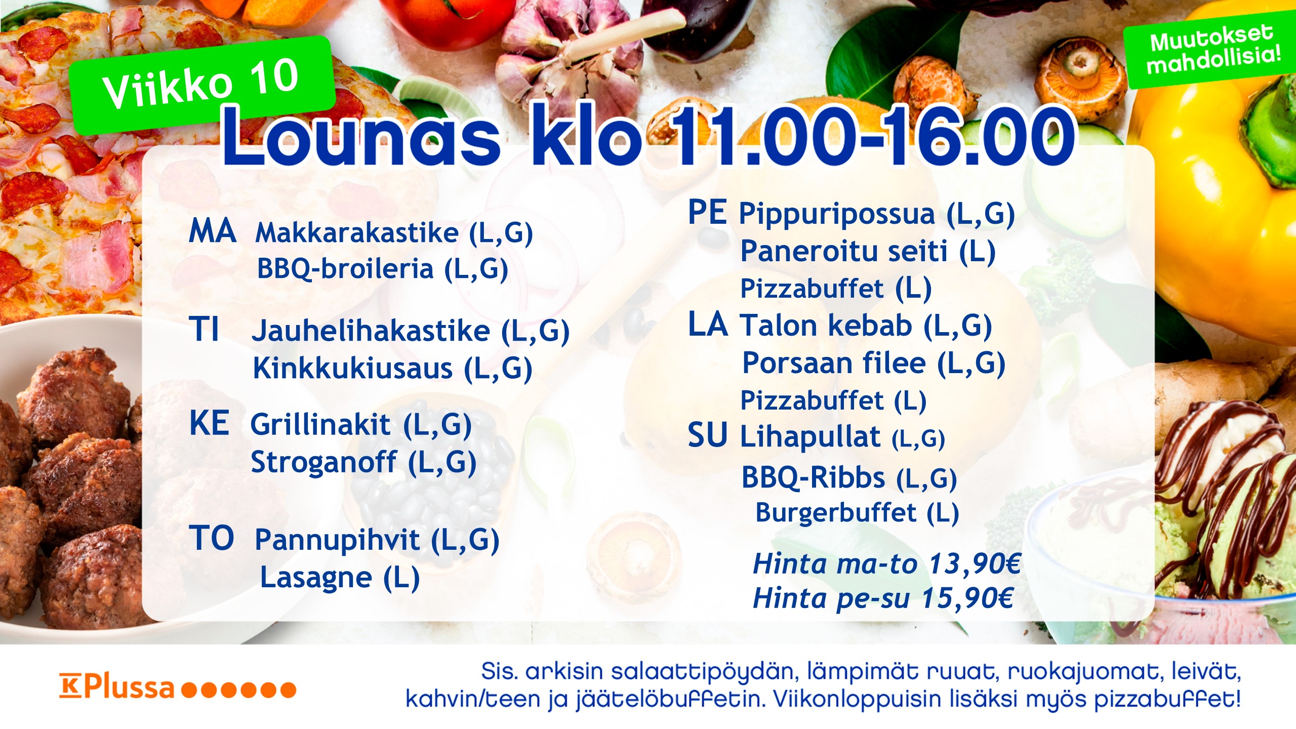 Noutopöytälounaaseen kuuluu aina runsas salaattipöytä, pääruuat lisukkeineen, leivät, levitteet sekä ruokajuomana maito, kotikalja, mehu ja vesi. Jälkiruoka sekä jäätelöbuffet, lisäksi kahvi/tee.