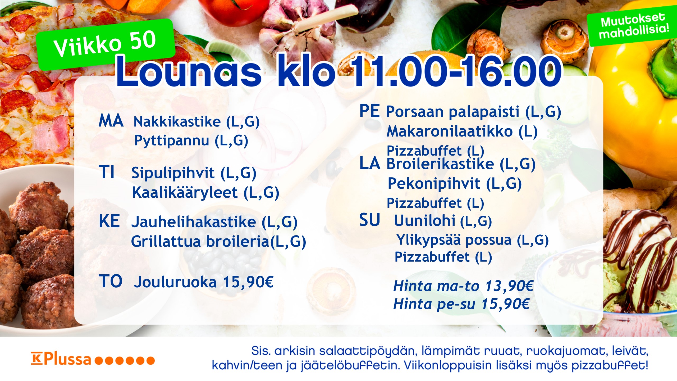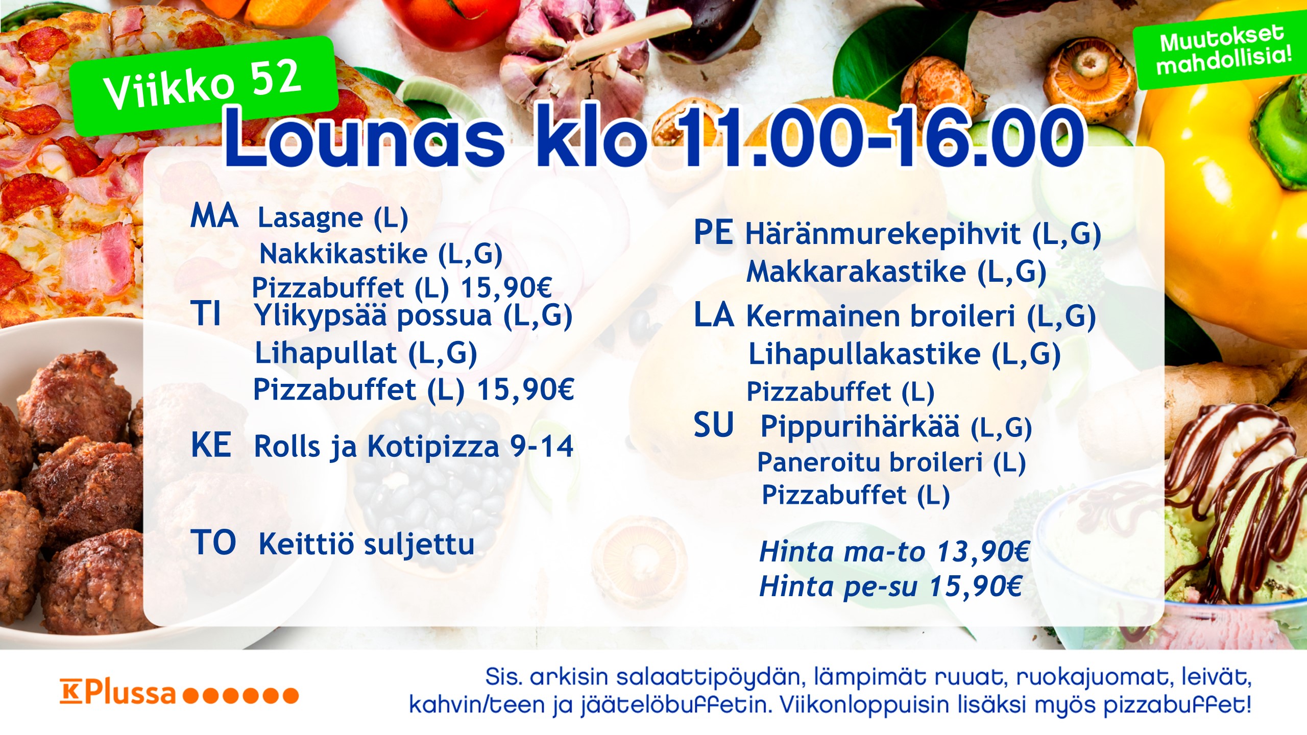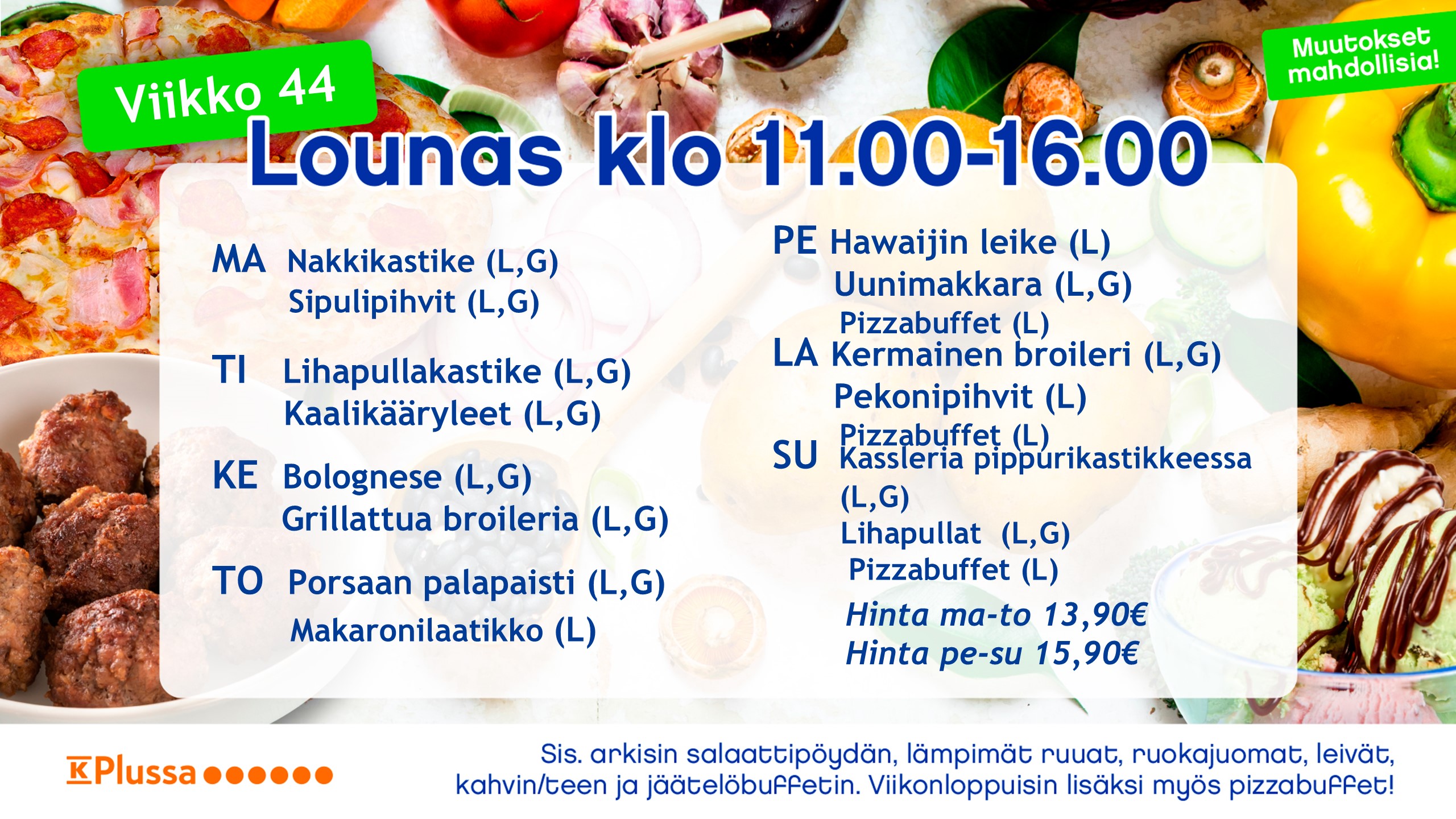Noutopöytälounaaseen kuuluu aina runsas salaattipöytä, pääruuat lisukkeineen, leivät, levitteet sekä ruokajuomana maito, kotikalja, mehu ja vesi. Jälkiruoka sekä jäätelöbuffet, lisäksi kahvi/tee.